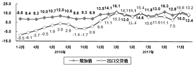 出口形势有所好转。2017年,出口交货值同比增长14.2%(2016年为下降0.1%),快于全部规模以上工业出口交货值增速3.5个百分点,占规模以上工业出口交货值比重为41.4%。其中,12月份出口交货值同比增长13.2%,比11月份回落3.4个百分点。