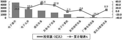 通信设备、电子器件行业投资增势突出。2017年,整机行业中通信设备投资较快增长,完成投资比上年增长46.4%,同比加快16.1个百分点;家用视听行业完成投资比上年增长7.6%;电子计算机行业完成投资比上年下降2.3%。电子器件行业完成投资比上年增长29.9%;电子元件行业完成投资比上年增长19.0%。