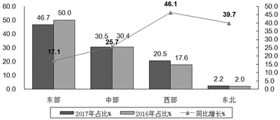 西部地区投资增速领跑,东北地区投资明显好转。2017年,东部地区投资增长平稳,完成投资同比增长17.1%,增速比2016年回落1.6个百分点,其中河北、广东投资增长较快,分别增长46.4%和41.9%;中部地区投资增长较快,完成投资同比增长25.7%,增速比2016年提高11.7个百分点,其中江西、安徽投资增长较快,分别增长76.2%和24.6%;西部地区投资增速领跑,完成投资同比增长46.1%,增速比2016年提高26.3个百分点,其中云南、贵州、四川投资增长较快,同比分别增长338.9%、120.9%和118.0%;东北地区投资由降转升,完成投资同比增长39.7%(2016年为下降29.6%),黑龙江、辽宁投资分别增长109.7%和60.8%。