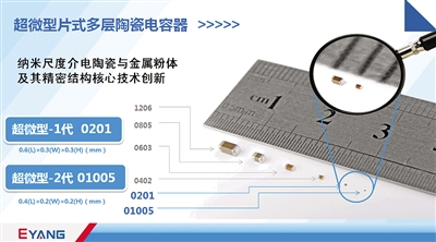 深圳市宇阳科技发展有限公司承担的国家强基工程项目“移动互联用超微型片式多层陶瓷电容器”再次取得新进展:在超微型-1代产品0201实现产业化的基础上,超微型-2代产品01005研发成功,达成产业化能力。到去年为止,两者共计形成近900亿片的年总产能。
