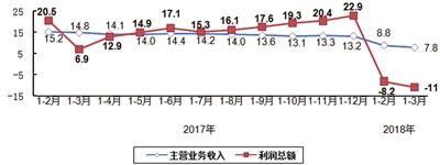 第一季度,全行业实现利润总额同比下降11.0%。主营业务收入利润率为3.32%,同比下降0.7个百分点;企业亏损面33.6%,同比扩大6.3个百分点,亏损企业亏损总额同比增长62.6%。