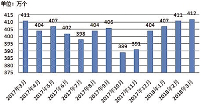 我国市场上移动互联网应用数量保持稳定。2018年第一季度,活跃移动应用规模增加8万款,截至3月底,我国市场上监测到的移动应用为412万款。3月份,我国第三方应用商店与苹果应用商店中新上架15万款移动应用(App)。截至3月底,我国本土第三方应用商店移动应用数量达到230万款,苹果商店(中国区)移动应用数量为182万款。