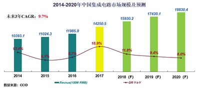 由于同样的原因,2017年中国半导体市场也同比大增17.5%,规模达到16708.6亿元,其中集成电路市场规模达到14250.5亿元,同比增长18.9%。