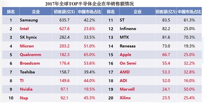 根据各家公司的财报,2017全球20家顶级的半导体企业,2017年在中国的业务额占到了其总业务额的近40%,中国市场已经成为最不可忽视的单一区域市场。