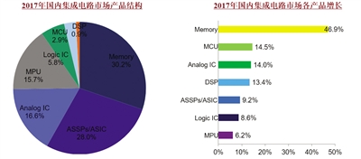 毫无疑问,2017年全球半导体市场最为火爆的产品是存储器。以DRAM和Nand Flash为代表的存储器产品价格在2017年上涨超过50%,导致全年全球存储器市场规模增长了61.5%。这一情况是由多方面因素造成的:一方面是以智能手机为代表的智能终端产业在消费升级的趋势下对存储器的需求大增,还有就是以数据中心为代表的大规模存储系统应用持续升温,也带动了存储器市场的持续火爆。另一方面,三星、海力士、美光等存储器大厂,纷纷推迟或是暂时取消了自身的扩产计划,导致2017年新增的产能跟不上市场需求的增长。存储器同样是中国集成电路市场增长最为迅猛的产品,全年增速高达46.9%,存储器的市场占比首次超过了30%。