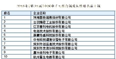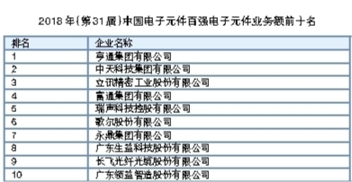 通过兼并重组,连接器龙头企业立讯精密工业股份有限公司正向电声器件行业大踏步迈进,2017年电子元件业务额增速高达145%,在元件百强中的总名次也得以前进到第四名。歌尔股份有限公司、富通集团有限公司、永鼎集团有限公司、长飞光纤光缆股份有限公司、广东生益科技股份有限公司、厦门宏发电声股份有限公司分列本届元件百强第五至第十名。其中长飞光纤光缆股份有限公司是时隔3年后,再次跻身元件百强前十名行列。