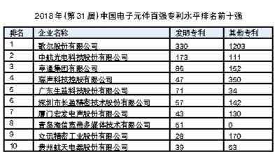 按照发明专利与其他专利2.5∶1的权重衡量本届电子元件百强的专利水平,歌尔股份、中航光电和亨通集团三家公司跟前两届一样,包揽了前三名。歌尔股份有限公司2017年获得了330项发明专利和1203项其他专利,依然远超诸强,连续三年授权专利数超千项,歌尔股份创造了电子元件百强的新纪录。