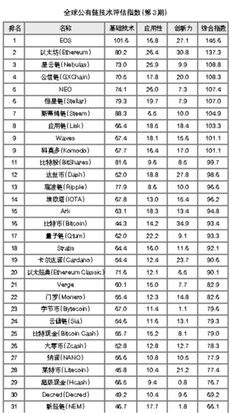本报讯 7月20日,赛迪全球公有链技术评估指数(第3期)在北京正式发布。结果显示,EOS的技术评估总指数为145.6,蝉联榜单首位。以太坊则继续以137.3的综合得分屈居次席。评估总指数位于第3名到第5名的公有链依次为星云链、公信链和NEO。比特币公有链技术评估总指数为93.4,位列榜单第16位,比上期提升1位。