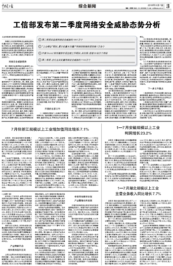 7月份浙江规模以上工业增加值同比增长7.1%
