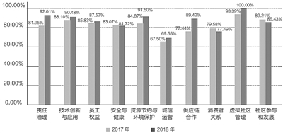 供应链合作综合得分率为89.42%,2017年为77.44%,同比提升15.47%,是所有主题中提升最明显的指标。评估对象在供应商选择与评价、供应商沟通与协作方面均有突出表现,说明评估对象更加注重运用全面、科学的评价体系进行供应商的评估和选择,对供应商在内的合作伙伴给予多方面、多渠道的支持,帮助其全面发展,以此实现自身供应链的建设,并带动产业链上的伙伴企业实现多方价值共赢。