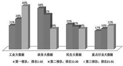 其次,不同梯队省市大数据应用各有侧重。将全国31个省市按照大数据应用排名顺序划分为3个梯队,排名前10的为第一梯队,排名第11~20的为第二梯队,排名第21~31的为第三梯队。第一梯队工业、政务、民生、重点行业大数据应用指数占比分别为22%、38%、23%、17%,其中政务应用成为发展重点;第二梯队工业、政务、民生、重点行业大数据应用指数占比分别为28%、32%、21%、19%,其中工业应用较第一梯队比重有所增加,政务应用比重有所减少;第三梯队工业、政务、民生、重点行业大数据应用指数占比分别为40%、19%、19%、22%,其中工业应用成为发展重点,较第一、二梯队都有所增加。