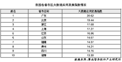 大数据应用指数由工业应用、政务应用、民生应用和重点行业应用4个变量决定。全国大数据应用总指数达到356.82,平均指数达到11.51。其中,广东大数据应用指数达到20.62,位列全国第一,北京、浙江分别以19.44和17.58排名第2和第3位。