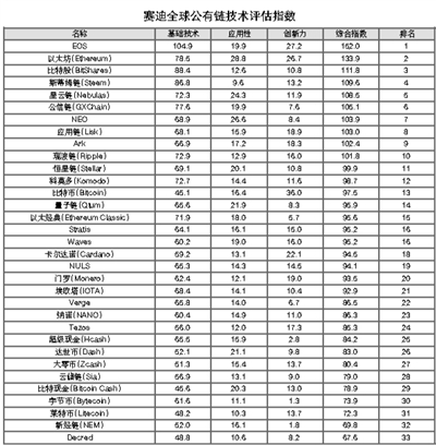 本报讯 11月20日,中国电子信息产业发展研究院在上海发布了第7期赛迪全球公有链技术评估指数。评估结果显示,EOS、以太坊、比特股依然占据榜单前三位,综合指数分别为152.0、133.9和111.8。位列榜单第4位至第10位的是斯蒂姆链、星云链、公信链、NEO、应用链、Ark和瑞波链。比特币综合指数为97.5,位列榜单第13位,比上期提升6个位次。