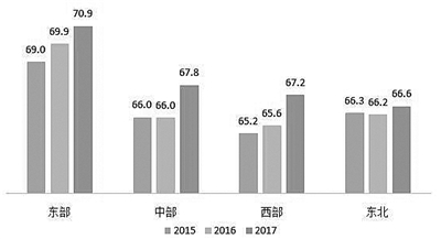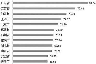 2017年分地区指数最高分78.6,最低分63.8,均分为68.6,比上年提升1.3分,均分以上省市12个。广东、江苏、浙江、上海、北京连续三年处于前五名之内,其中浙江提升两名至第三位。
