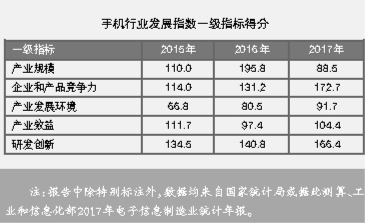 从一级指标看,企业和产品竞争力指标、研发创新指标较上年实现了更快的增长,分别提升41.5分和25.6分;企业主营业务收入利润率提升0.5个百分点,产业效益指标得分由降转升;手机行业固定资产投资占电子信息制造业的比重连续三年提升,产业发展环境指标继续平稳增长。