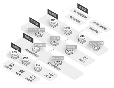 协鑫光伏与阿里云合作的整体技术框架分为三大部分:车间源数据、大数据存储分析区、业务区。