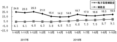 1—10月,电子信息制造业加快结构调整,推动转型升级,产业景气度较高,生产和投资增速在工业各行业中保持领先水平。受成本上升、价格回落等因素影响,行业利润低速增长,电子产品出厂价格继续下降但降幅有所收窄。