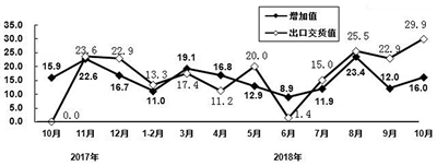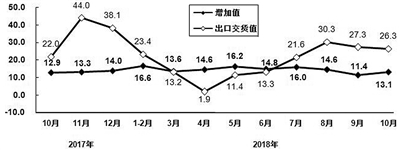 1—10月,规模以上电子信息制造业出口交货值同比增长10.8%,其中10月份同比增长20.8%。
