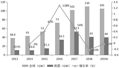 (一)光伏产业规模稳中有升,分布式发电成为发展重点。2018年,全球光伏新增装机市场将达到110GW,创历史新高,同比增长7.8%。我国新增装机量将达41GW,同比下降23%,但仍居全球首位。