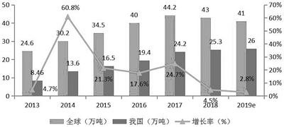 (三)生产规模持续扩大,产业触底反弹。2018年,全球多晶硅产量受光伏市场影响,产量近20年来呈首次下滑态势,仅为43万吨,同比下降2.7%,但电子级多晶硅受半导体硅片价格上涨所影响,市场需求较为紧俏,产量同比增幅达到10%以上。我国多晶硅开工企业约19家,产能为27万吨,产量约为25.3万吨,同比增长4.5%,进口量约为12万吨。受光伏下游市场影响,多晶硅产品价格快速下滑,多家企业止盈转亏,部分企业甚至开始停产甚至破产。全球光伏组件产量继续增长至120GW。我国光伏组件产量约为82GW,同比增长逾9%,出口量在40GW左右,占比约为50%,同比增长近27%。