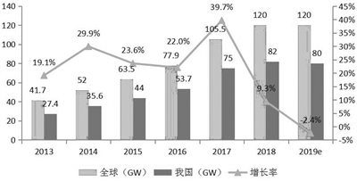 展望2019年,在光伏发电成本持续下降、政策持续利好和新兴市场快速兴起等有利因素的推动下,全球光伏市场仍将保持在较高水平,预计全年全球光伏新增装机量将达到105GW,我国将保持在35GW~40GW之间。