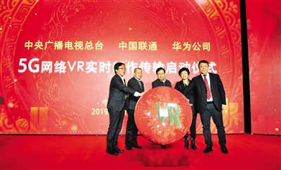中央宣传部分管日常工作的副部长王晓晖,吉林省委常委、宣传部长王晓萍,中央广播电视总台央视副台长孙玉胜、中国联通集团公司副总经理梁宝俊、华为公司高级副总裁鲁勇等出席仪式并共同启动央视春晚长春分会场5G网络VR实时制作传输,大屏幕上随即呈现出5G网络传输的央视春晚候播大厅和长春分会场全景电视信号画面。在接下来的央视春晚预热节目中,中央广播电视总台将实现VR全景互动,带给观众全新的视觉感受。同时,还将制作一批春晚VR短视频在新媒体平台投放,为观众提供沉浸式的春晚观看体验。