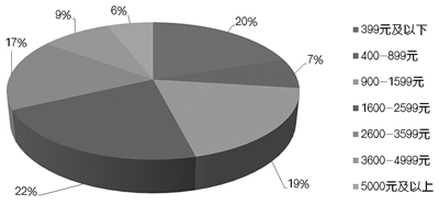 从不同价格段来看,1600~2599元的零售额市场占比为22%,是零售额占比最高的价格段。399元及以下价格段占据了20%的零售额份额,900~1599元价格段的零售额市场占比为19%,2600~3599元价格段的零售额市场占比为17%。零售额占比最大的1600~2599元价格段也是零售额增长最快的价格段,同比增幅达到47.56%,900~1599元居次席。3600~4999元价格段虽然零售额份额和零售量份额只有9%和2%,但是增速分别达到36.91%和43.48%,显示出不错的增长潜力。