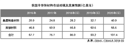半导体材料主要包括晶圆制造材料与封装测试材料两大类。其中,晶圆制造材料包括硅片、光刻胶、光掩膜版、电子特气、湿化学品、溅射靶材、CMP抛光材料等,2018年国内晶圆制造材料总体市场规模约28.2亿美元;封装材料包括引线框架、基板、陶瓷封装材料、键合丝、封装树脂、芯片贴装材料等,2018年国内封装材料市场规模约为56.8亿美元。2018年,晶圆制造材料与封装测试材料总计市场规模约为85亿美元。