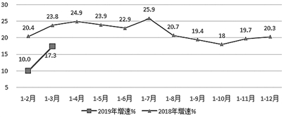 互联网业务收入增速明显回升。第一季度,我国规模以上(指上年度互联网和相关服务收入500万元以上的企业)互联网和相关服务企业(简称互联网企业)完成业务收入2402亿元,同比增长17.3%,增速较1—2月提高7.3个百分点,低于去年同期6.5个百分点。