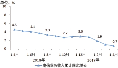 电信业务收入增速持续放缓。1—4月,电信业务收入累计完成4463亿元,同比增长0.7%,增速同比回落3.8个百分点,较1—3月回落0.3个百分点。