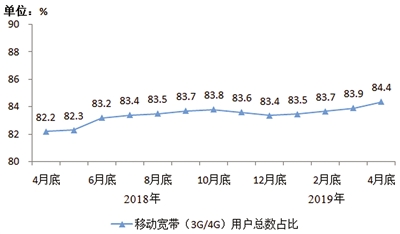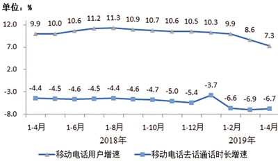移动电话用户规模小幅下降,4G用户占比稳步提高。截至4月底,三家基础电信企业的移动电话用户总数达15.9亿户,同比增长7.3%,但比上月末减少581万户。其中,移动宽带用户(即3G和4G用户)总数达13.4亿户,占移动电话用户的84.4%;4G用户规模为12.1亿户,占移动电话用户的75.9%,较上年末提高1.5个百分点。