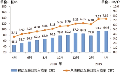 当月户均移动互联网接入流量(DOU)环比小幅提升。1—4月,移动互联网累计流量达351亿GB,同比增长122.2%;其中通过手机上网的流量达到349亿GB,同比增长125.8%,占移动互联网总流量的99.6%。4月当月户均移动互联网接入流量(DOU)达到7.32GB,同比增长110.2%。
