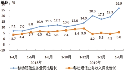 移动短信业务量和收入同比均保持较快增长。在服务登录和身份认证等服务持续普及带动下,全国短信业务的业务量和收入保持同步增长。1—4月,全国移动短信业务量同比增长26.9%,移动短信业务收入完成128.8亿元,同比增长5.8%。