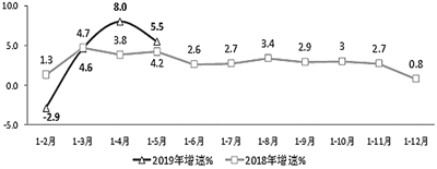 利润总额增速回升至两位数。1—5月,全行业实现利润总额3228亿元,同比增长10.5%,增速同比提高0.2个百分点,比1—4月回升1.8个百分点。1—5月,全行业主营业务利润率8.2%,同比略低0.2个百分点。