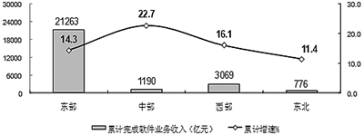 东、西部地区软件业保持较快增长,中部地区增势突出。1—5月,东部地区完成软件业务收入21263亿元,同比增长14.3%,增速与去年同期持平。中部地区完成软件业务收入1190亿元,增长22.7%,增速同比提高3.3个百分点,高出全国平均水平8个百分点。西部地区完成软件业务收入3069亿元,增长16.1%,增速同比提高2.2个百分点。东北地区完成软件业务收入776亿元,同比增长11.4%,增速同比提高2.8个百分点。四个地区软件业务收入在全国总收入中的占比分别为:80.8%、4.5%、11.7%和3.0%。