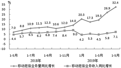 移动短信业务量和收入同比均保持增长。在服务登录和身份认证等服务普及带动下,短信业务的业务量和收入保持同步增长。1—5月,全国移动短信业务量同比增长32.4%,移动短信业务收入完成165.7亿元,同比增长7.1%。