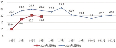 互联网业务收入保持两位数增长。1—5月,我国规模以上(指上年度互联网和相关服务收入500万元以上的企业,5月开始,完成年报工作的省份按照2018年年报结果核定)互联网和相关服务企业(简称互联网企业)完成业务收入4282亿元,同比增长19.4%,增速比去年同期回落4.5个百分点,但比第一季度加快2个百分点。