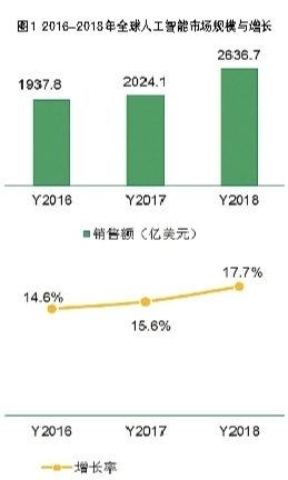 目前全球人工智能市场仍呈现加速增长态势,主力厂商着重抢先布局人工智能产业生态链。伴随人工智能技术进入相对成熟阶段,智能终端产品销量稳定增加,促进人工智能市场发展。2018年,全球人工智能市场规模达到2636.7亿美元,同比增长17.7%。
