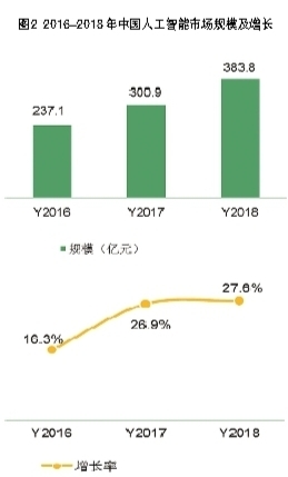 机器学习、深度学习等算法能力的增强极大地促进了计算机视觉、语音等技术的不断突破,中国技术主导型初创型公司不断涌现。2018年中国人工智能市场并未受到经济下行压力的明显影响,依然保持高速增长,整体市场规模达到383.8亿元,同比增长27.6%。
