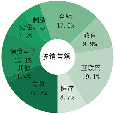 从行业结构分布来看,互联网仍是目前收入占比最大的行业市场,在2018年,这一占比达到19.1%。2018年,安防行业应用市场延续去年之势,继续占据行业关注的焦点。不过,与2017年热炒AI概念不同,2018年安防行业专注于AI应用落地,更为务实,其增速普遍高于市场平均水平,占比与金融相当。