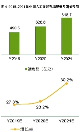 随着人工智能市场应用的再深化,传统产业对于人工智能应用结合的需求持续升温。预计未来三年中国人工智能市场规模仍将保持30%左右的增长速度,到2021年将达到818.7亿元。