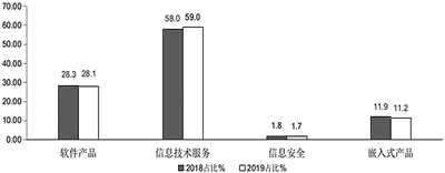 信息技术服务收入较快增长,电子商务平台技术服务收入增势突出。1—8月,信息技术服务实现收入26476亿元,同比增长16.9%,增速同比回落1.6个百分点,较1—7月回落0.4个百分点,高于全行业平均水平2个百分点,在全行业收入中占比为59.0%。其中,云服务收入同比增长13.6%,较1—7月回落0.1个百分点;大数据服务收入增长18.9%,比1—7月回升1.9个百分点;电子商务平台技术服务收入增长28.7%,同比提高9.5个百分点;集成电路设计服务收入增长9.4%,同比提高2.4个百分点,较1—7月回落3.3个百分点;其他信息技术服务(信息技术咨询设计服务、系统集成、运维服务、运营服务等)增长15.0%,较1—7月回升0.7个百分点。