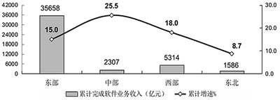 东、西部地区软件业收入保持较快增长,中部地区增势突出。1—8月,东部地区完成软件业务收入35658亿元,同比增长15.0%,增速与去年同期持平。中部地区完成软件业务收入2307亿元,增长25.5%,增速同比提高8.5个百分点,高出全国平均水平10.6个百分点。西部地区完成软件业务收入5314亿元,增长18.0%,增速同比提高3.6个百分点。东北地区完成软件业务收入1586亿元,同比增长8.7%,增速同比回落0.3个百分点。四个地区软件业务收入在全国总收入中的占比分别为:79.5%、5.1%、11.9%和3.5%。