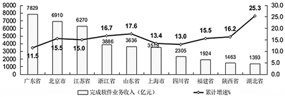 主要软件大省收入保持两位数增长,部分中西部省份增长迅速。1—8月,软件业务收入居前列的广东(同比增长11.5%)、北京(同比增长15.5%)、江苏(同比增长15.0%)、浙江(同比增长16.7%)、山东(同比增长17.6%)和上海(同比增长13.4%)完成业务收入合计32050亿元,占全国比重为71.4%,其中浙江、山东增速分别高于全国平均水平1.8个、2.7个百分点。增速居前5名的省份有:云南(增长85.0%)、广西(增长82.7%)、江西(增长72.0%)、海南(增长55.8%)和安徽(增长30.2%)。