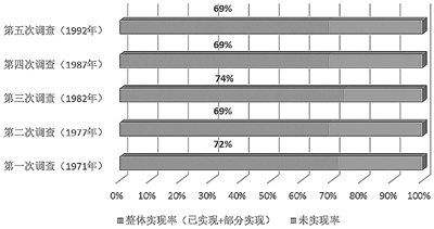 坚持不懈地组织周期性技术预测调查,并在20年后回顾预测的实现率。日本政府从1971年开始,每隔5年就会组织一次大规模的技术预测调查,预测调查的时间跨度为30年,调查结论将会为日本科技基础计划等科技政策的制定提供支撑。除了“善始”,日本政府还注意“善终”,每隔20年左右都会对之前相应的一次预测进行实现率的评价。目前第1次至第5次科学技术预见调查已经进行评价,整体实现率(已实现+部分实现/全体)保持在70%左右。