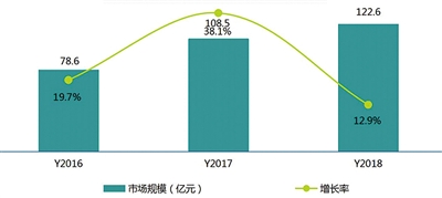 2018年,全球区块链市场规模呈现稳定增长,达到122.6亿元。受到欧美国家对区块链行业新一轮监管政策的影响,全球区块链市场增速较2017年有所下降,达12.9%。