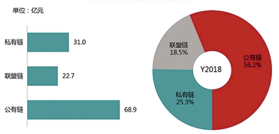 从组成结构方面看,区块链市场结构由公有链、联盟链和私有链组成。2018年,公有链占区块链市场结构的主要份额,规模达到68.9亿元,占比56.2%;私有链规模达到31.0亿元,占比25.3%;联盟链规模达到22.7亿元,占比18.5%。