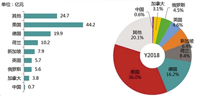 2018年,美国在全球区块链市场的领导地位进一步巩固,在全球区块链市场占36.0%的市场份额;德国在全球区块链市场中占16.2%,位居第二;欧洲约占全球1/3的市场份额。
