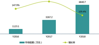 2018年,中国区块链市场从爆发式增长逐渐回归理性增长。整体市场规模达到6840.7万元,同比增长109.4%。