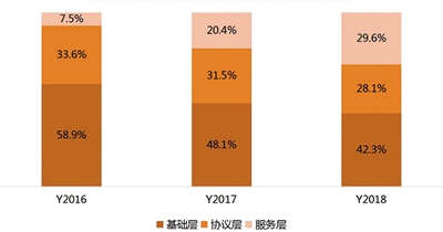 从区块链平台细分领域来看,2018年,服务层的占比大幅提升,达到29.6%,增长了22.1个百分点。而基础层与协议层占比有小幅下降,分别达到42.3%和28.1%,但浮动总体趋于平稳。